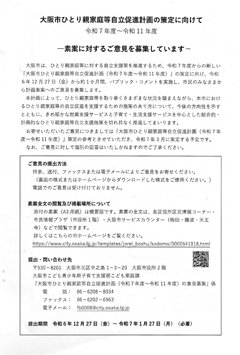 大阪市が「大阪市ひとり親家庭等自立促進計画の策定に向けて」と素案へのパブリックコメントを求めています。