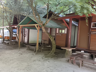 夜はクーラーの効いたロッジで寝袋で寝ました。これぞアウトドアの醍醐味!