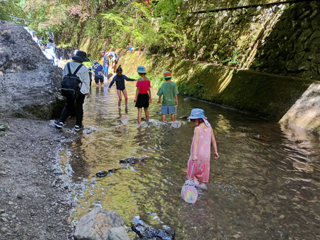 川の水が清らかで冷たく、水着に着替えたりパンツの裾をまくり、カニやメダカとりに夢中な子どもたち。
