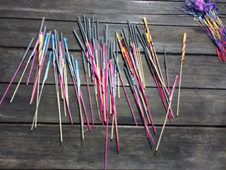 花火が沢山あり線香花火が、落ちずにもつか競う子どもたち。