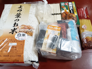 箱の中は、米、餅、カレールー、そば、パスタ化粧品です。